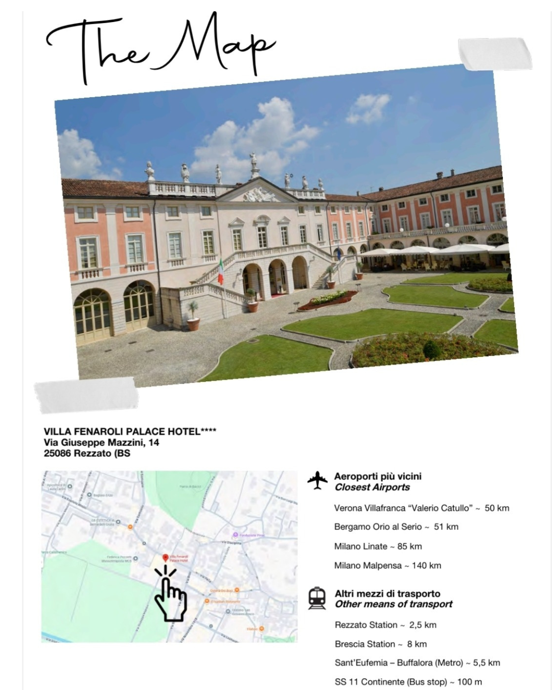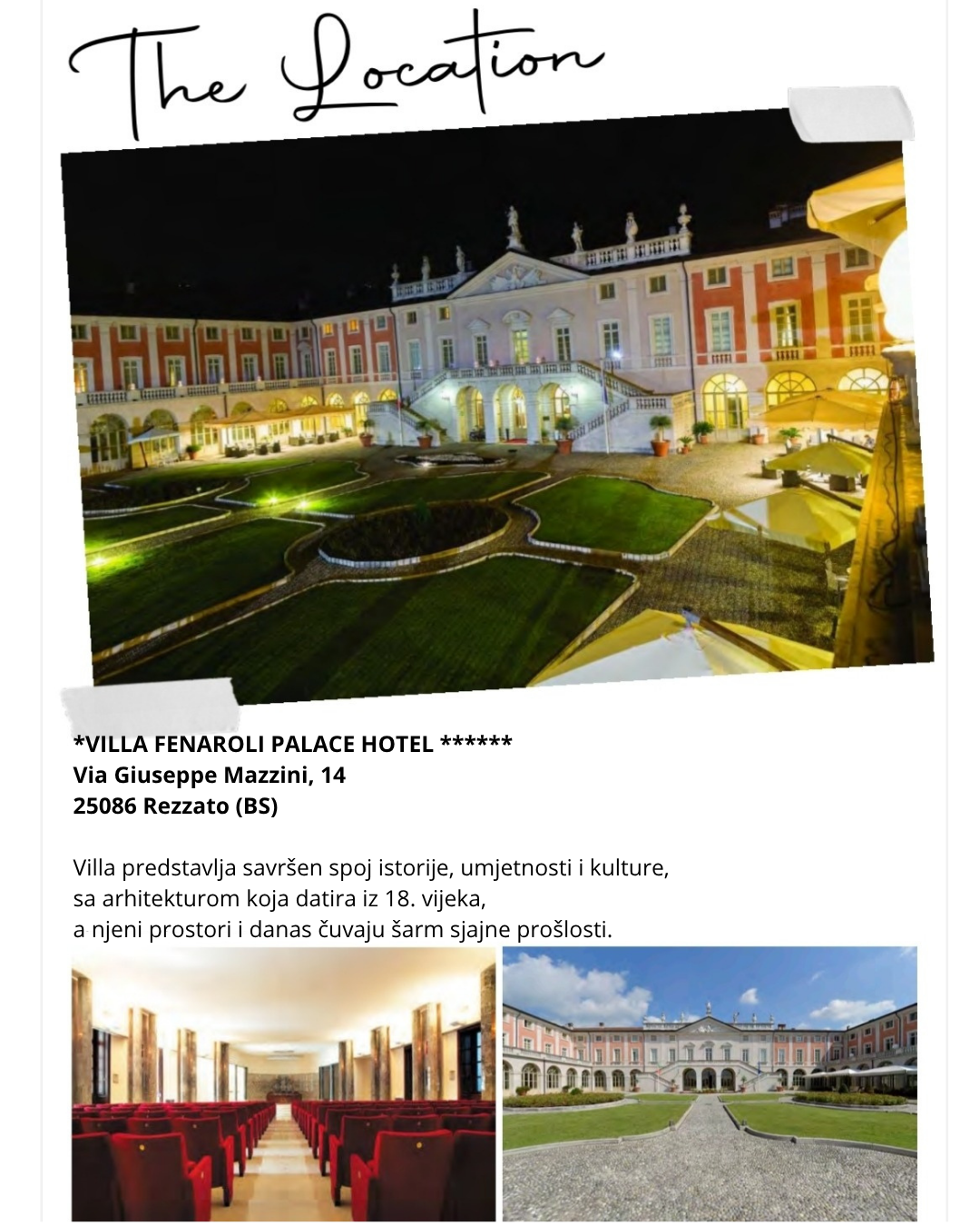 - Lokacija održavanja seminara: VILLA FENAROLI PALACE HOTEL Via Giuseppe Mazzini, 14 25086 Rezzato, Italija , Pokrajina Milana